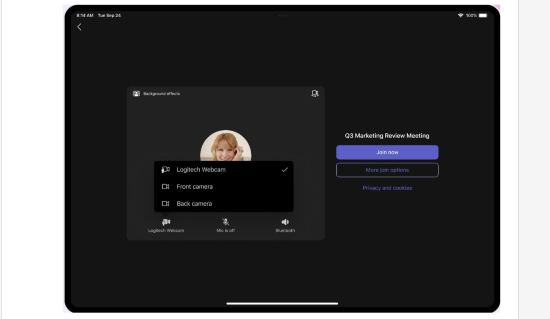 Teams on iPad now gives you more control over your meeting setup. You can select external microphones, speakers, and cameras directly from the pre-join screen or while in a meeting.