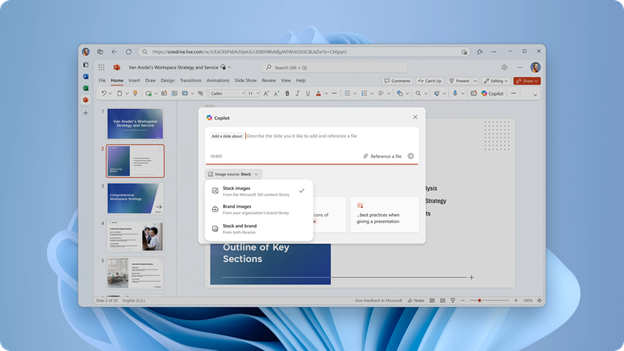 When creating slides with Copilot, PowerPoint can now automatically use approved enterprise assets from your organization’s SharePoint Organization Asset Library (OAL) or connected Templafy libraries. This means Copilot pulls trusted, on-brand images while generating slides, helping teams stay consistent without extra manual work.